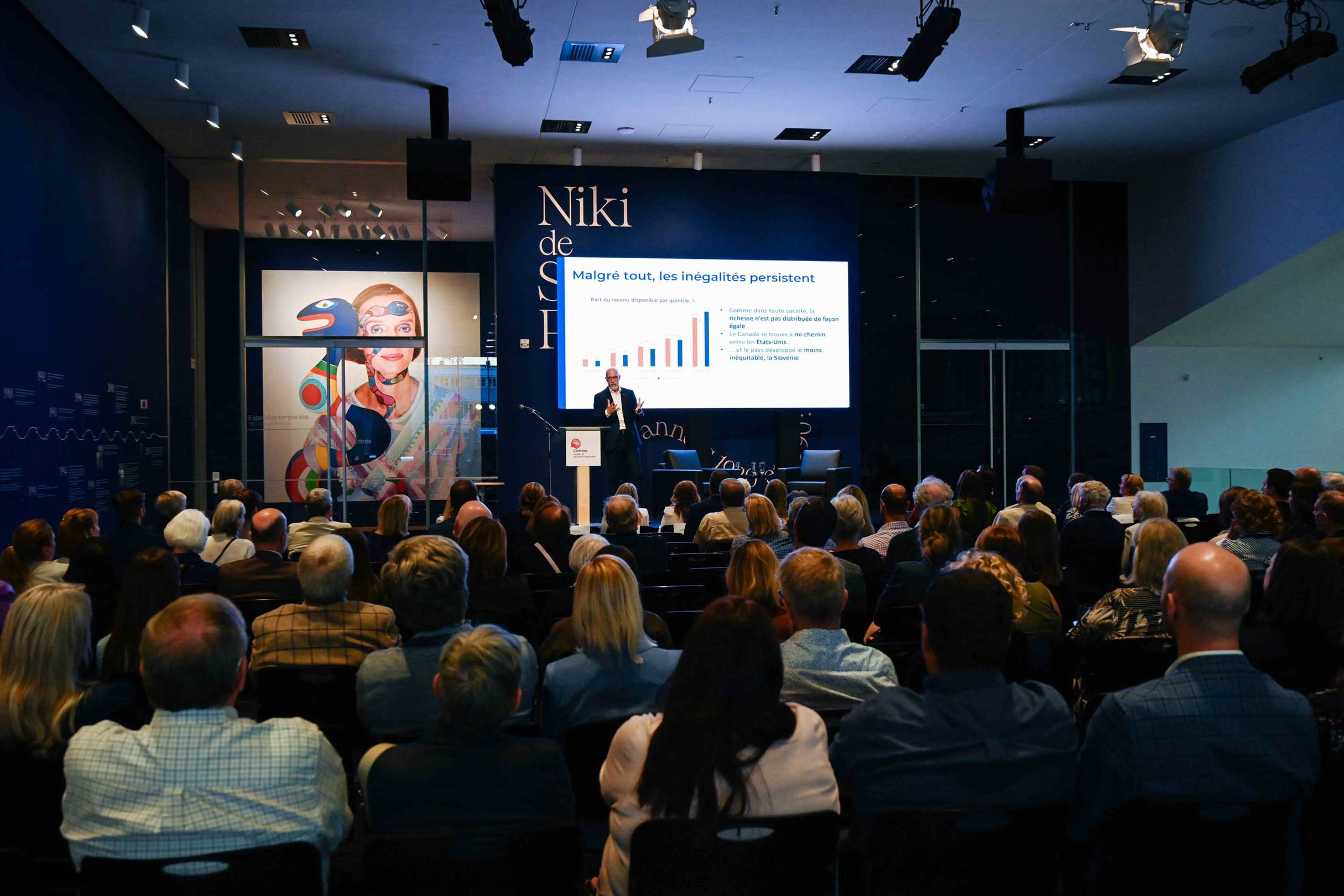Au cœur de l’événement, la conférence captivante de Sébastien Mc Mahon, stratège en chef et économiste sénior de iA Gestion mondiale d’actifs. Avec un regard lucide sur les enjeux économiques actuels et une capacité de vulgarisation indéniable, il a su captiver l’auditoire en exposant les grands enjeux économiques qui façonnent notre société. Mais surtout, il a rappelé avec conviction le rôle fondamental du communautaire et de la philanthropie dans la lutte à la pauvreté.